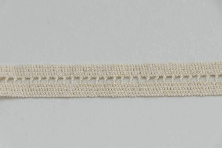 Tira de encaje bolillo tipo crochette para adornar prendas de vestir.